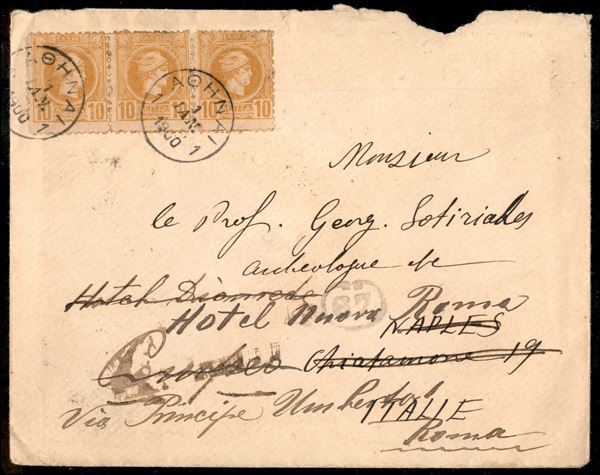 10 lepta (79) - striscia di 3 su busta da Atene a Roma del 1.1.900