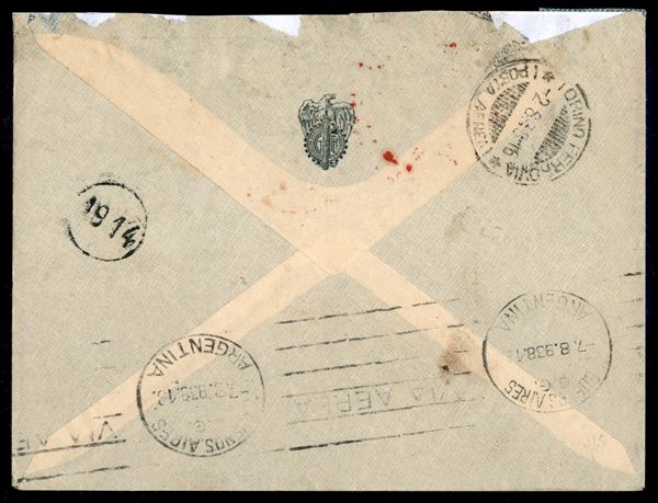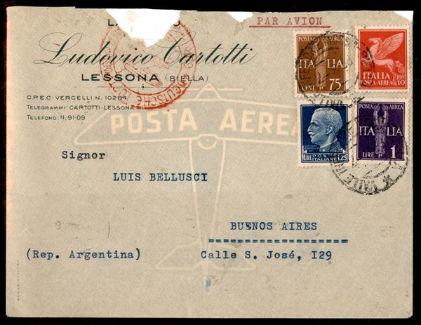 10 lire (17 - Aerea) + complementari (253 + Aerea 12 + 14) - aerogramma da Lessona a Buenos Airea del 2.8.38