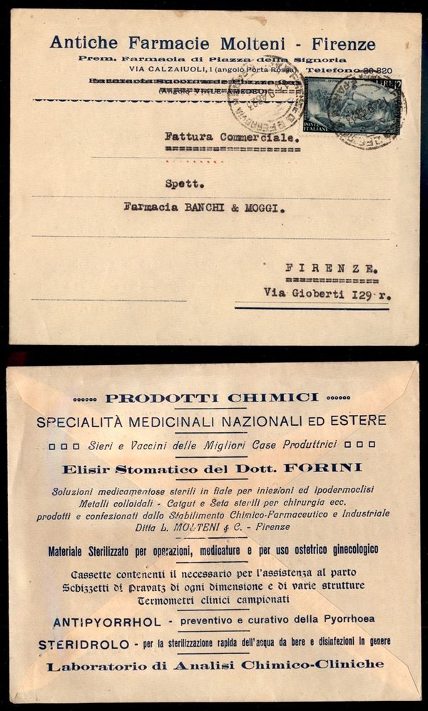 12 lire Risorgimento (586) isolato su busta pubblicitaria (medicinali) per cittą - Firenze 13.9.48