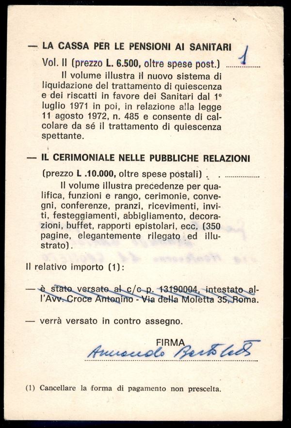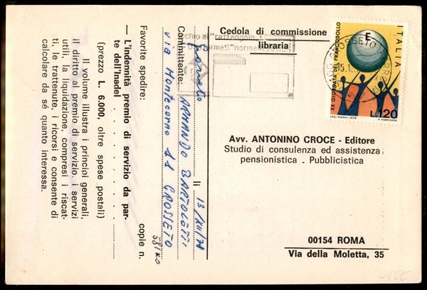 120 lire Giornata del Francobollo (1437) isolato su cedola di commissione da Grosseto a Roma del 15.12.78