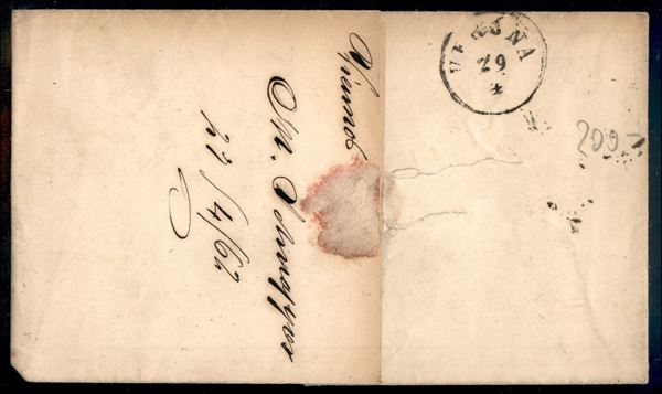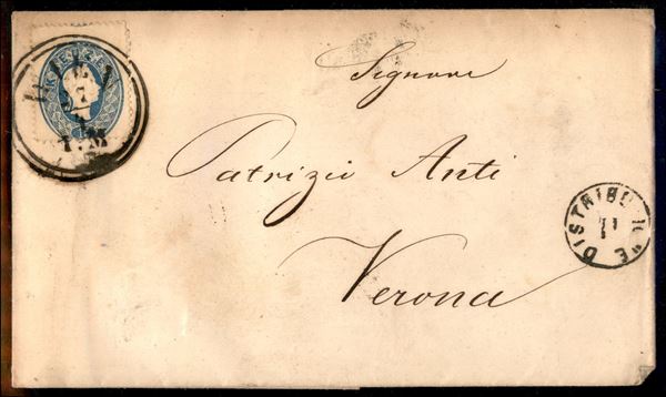 15 kreuzer (22) con dentellatura orizzontale spostata in alto (tracce dell'ovale sulla dentellatura superiore) - isolato su lettera da Vienna a Verona del 27.4.1862