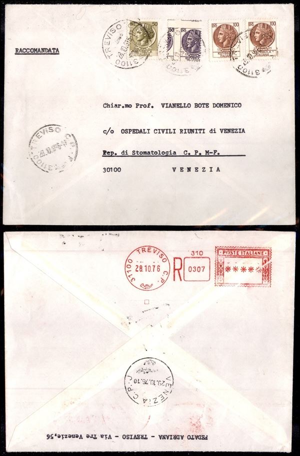 150 lire Siracusana (1083A) con dentellature spostate + complementari su raccomandata da Treviso a Venezia del 28.10.76