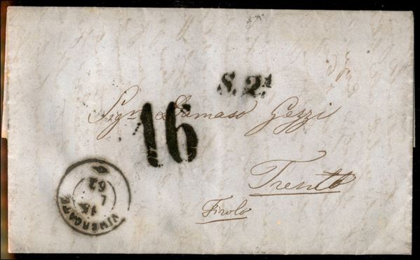 16 di Tassa + S.2 - lettera da Vimercate a Trento del 15.7.62 via Milano