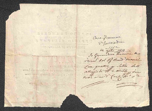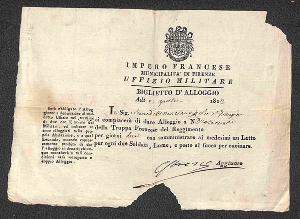 1813 (21 aprile) - Impero Francese/Municipalità di Firenze/Uffizio Militare - Biglietto d'Alloggio