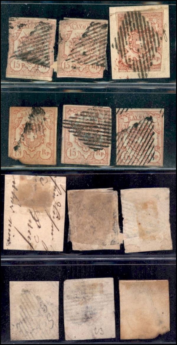 1852 - Rayon III - sei 15 rappen (12) usati (uno su frammento) - difetti - da esaminare