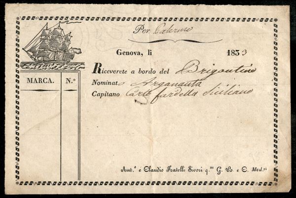 1853 - Genova - biglietto per Palermo col Brigantino Arganauta