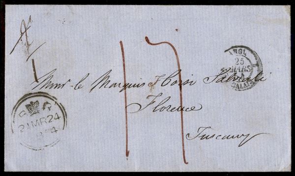 1854 (24 marzo) - busta da Londra a Firenze - tassata