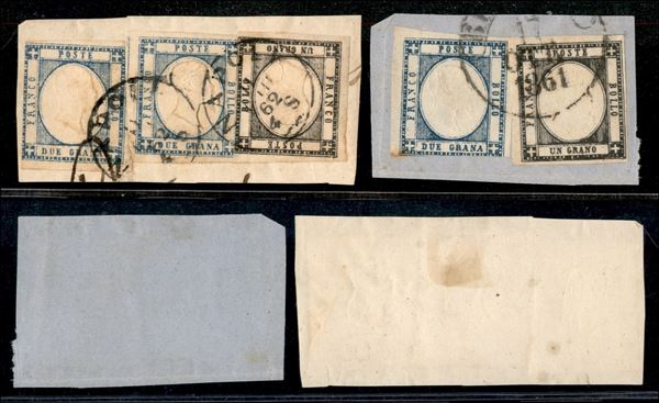 1861 - Due frammenti con affrancature bicolori (19 + 20 - 19 + 20 + 20) - tre pezzi corti da un alto