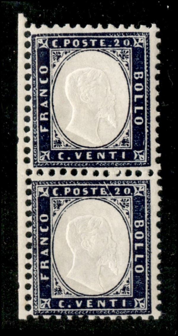 1862 - 20 cent (2) - coppia verticale bordo foglio - clichè rotto su E e punto di Poste nel pezzo inferiore - gomma integra (100++)