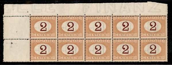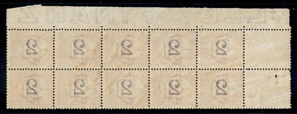 1870 - 2 cent (4) - blocco angolare di 10 con interspazio a sinistra (filigrana croce in alto) - gomma integra