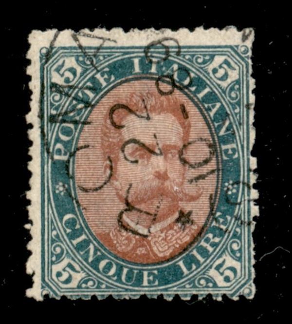 1889 – 5 lire Umberto (49) – Roma 22.10.89 – dentellatura carente a destra - timbrino di garanzia (3.000++)