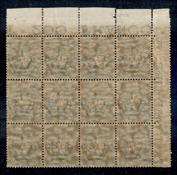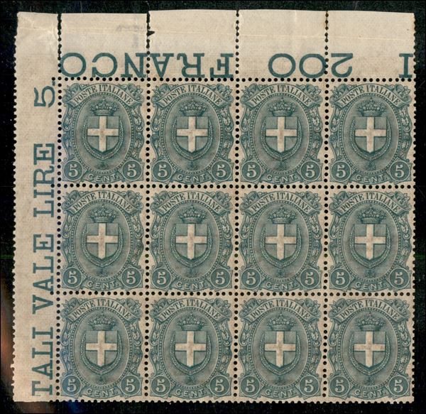 1897 - 5 cent Stemma (67) - blocco angolare di 12 - gomma integra - ottima centratura (4.800++)