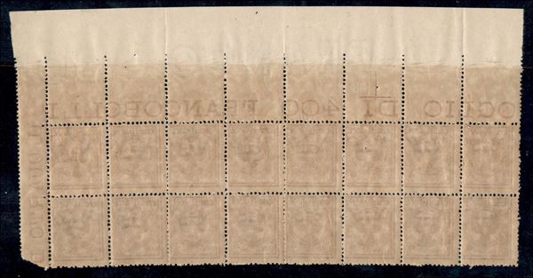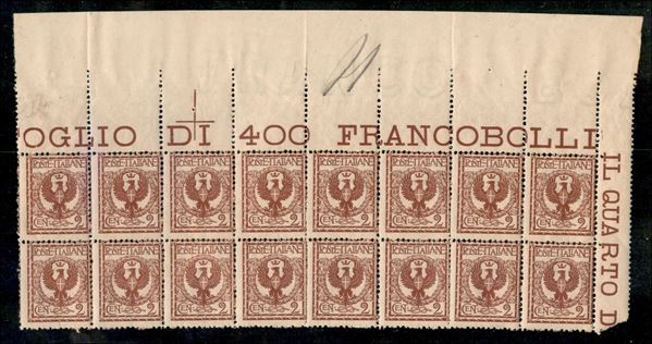1901 – 2 cent Floreale (69) – blocco angolare di 16 con filigrana obliqua (Franco Bol sul bordo superiore + Corona) – gomma integra - non catalogato