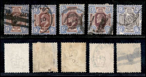 1902 - 9 pence Re Edoardo VII (112A) - insieme di 5 pezzi di tonalità colori diverse - usati - da esaminare
