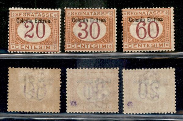 1903 - 20 cent (3) + 30 cent (4) + 60 cent (7) - insieme di 3 valori - gomma originale con traccia di linguella (150)