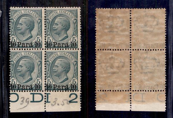 1907 - 10 para su 5 cent Leoni (10 varietà) - quartina con soprastampe in basso - gomma integra