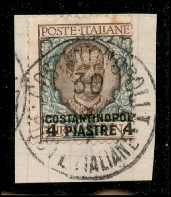 1909 - 4 piastre su 1 lira Floreale (25 cb varietà) - soprastampa spostata (I a cavallo) - usato su frammento - non catalogato