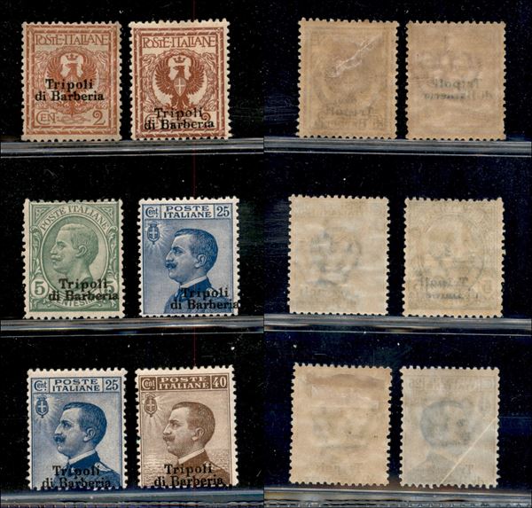 1909 - Sei valori (2 varietà + 2bb + 3 varietà bc + 6bb + 6bc + 7bb) con soprastampe spostate - gomma originale