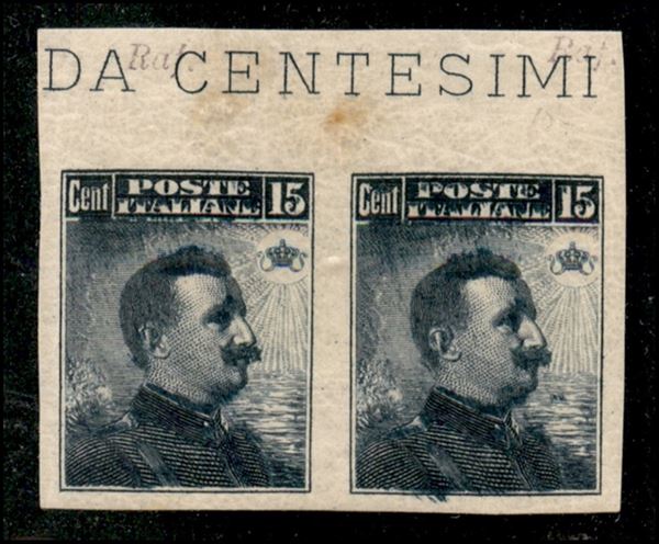 1911 - 15 cent Michetti (96e - stampa difettosa) - coppia bordo foglio non dentellata - sfaldatura della carta al centro precedente la gommatura - gomma originale - qualche punto chiaro