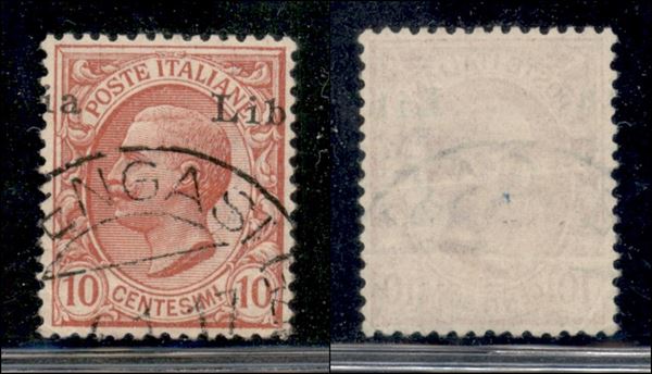 1912 - 10 cent Leoni (4/Ilf) usato - soprastampa obliqua a cavallo (Lib a destra in alto) - non quotato