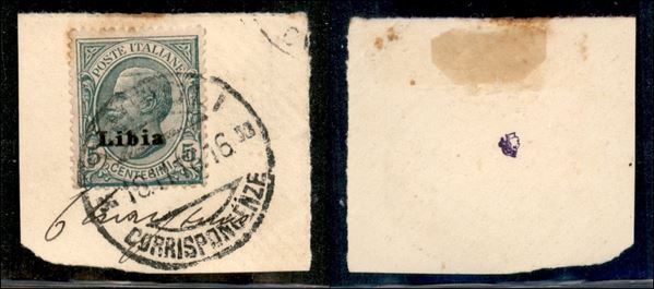 1912 - 5 cent Leoni (3e) con doppia soprastampa - usato su frammento (120+)