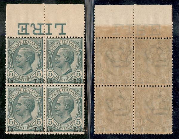 1912 - 5 cent Leoni (3oac) - quartina con soprastampa a cavallo (ia Lib) - gomma integra - dentellatura verticale centrale in parte aperta (900)