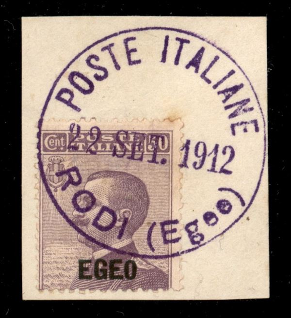 1912 - 50 cent Michetti (2) usato su frammento a Rodi (viola) nel giorno d'emissione il 22.9.12