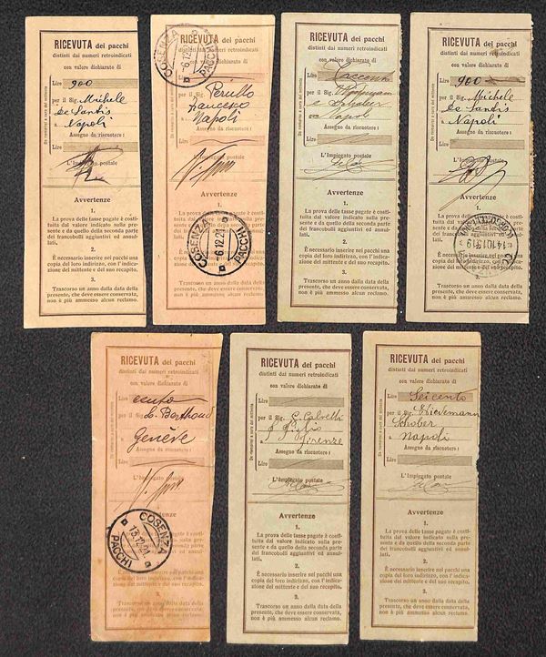 1914/1921 - Sette ricevute di bollettini pacchi con affrancature diverse - da esaminare