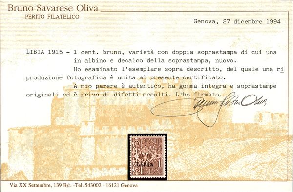 1915 - 1 cent Floreale (1w) con doppia soprastampa (una in albino) e decalco - gomma integra - cert. Savarese (225)