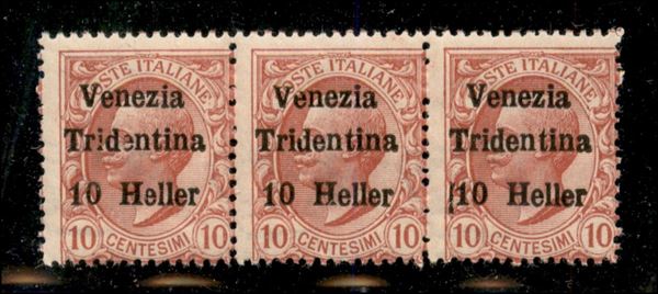 1918 - 10 heller su 10 cent (29) - striscia di 3 con spazio tipografico prima di 1 nel pezzo di destra - gomma integra - non catalogato