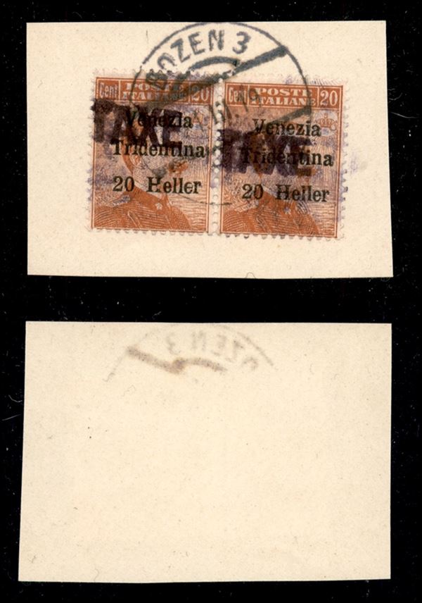 1918 - Taxe su 20 heller (32 varietà) coppia orizzontale con soprastampe a sinistra (oblique) - usata su frammento - non catalogato