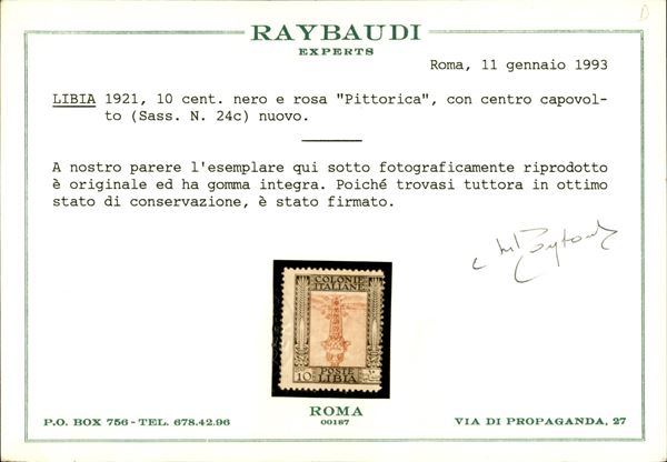1921 - 10 cent Pittorica (24c) - centro capovolto - gomma integra - cert. Raybaudi