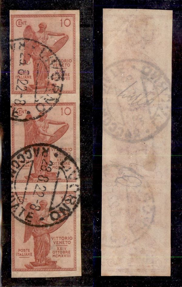 1921 - 10 cent Vittoria (120e) non dentellato - striscia verticale di 3 usata - Livorno 28.8.22 - Oliva