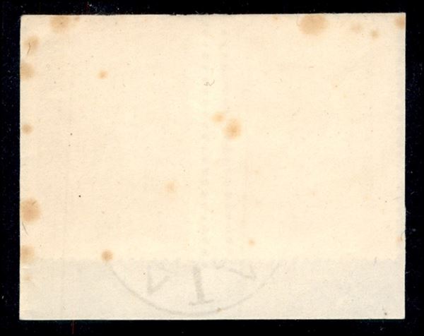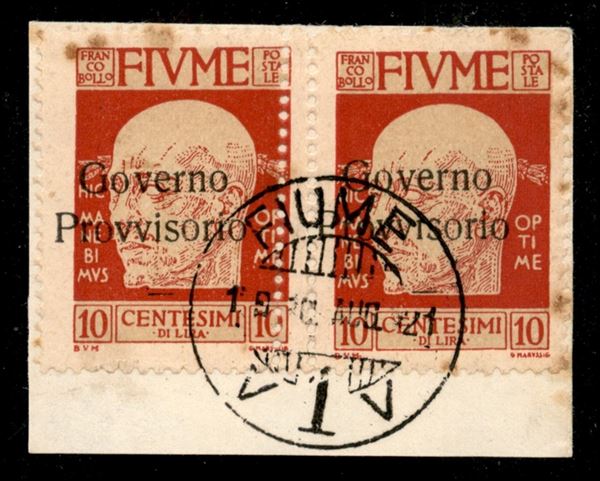 1921 - Coppia orizzontale del 10 cent Governo Provvisorio (150 varietà ob + z) usata su frammento - soprastampa a sinistra + doppia dentellatura verticale al centro (una obliqua) - non catalogata - ingiallimenti in alto e a destra