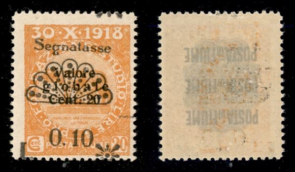 1921 - L. 0,10 su 20 cent Segnatasse (18oa) con soprastampa in basso (a cavallo) - gomma originale (150)