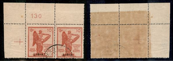 1922 - 10 cent Vittoria (35n/35) - coppia angolare usata - a sinistra numero di Tavola (130) + filigrana piccola croce