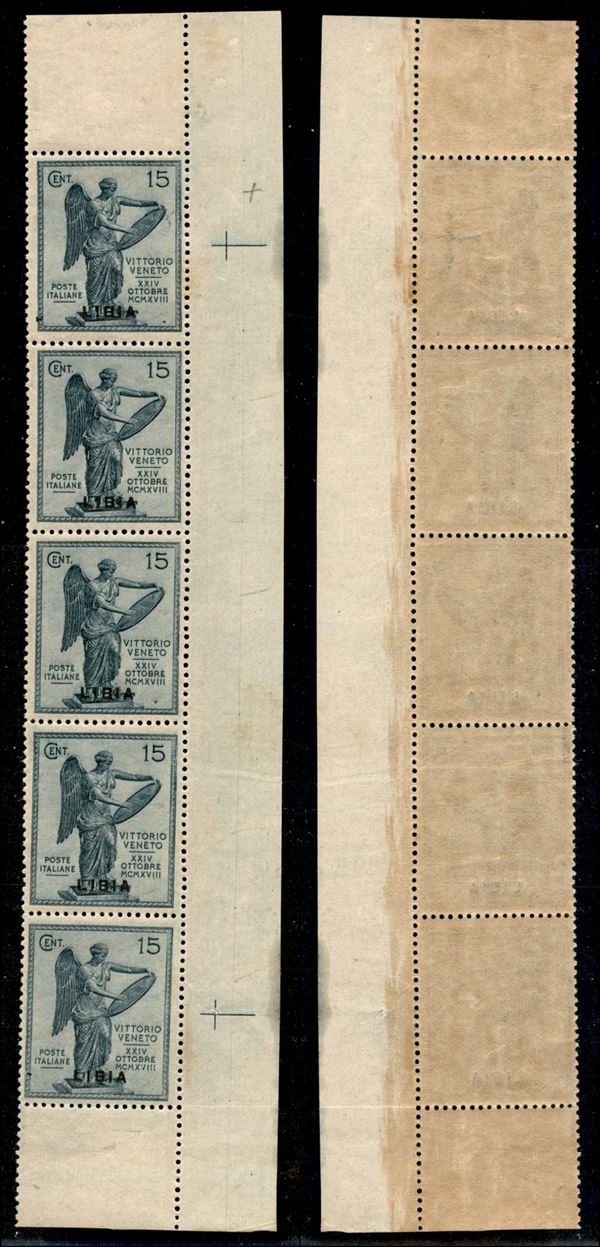 1922 - 15 cent Vittoria (36n/36) - intera striscia verticale bordo foglio - filigrana piccola croce in alto + quattro con traccia di filigrana - gomma integra