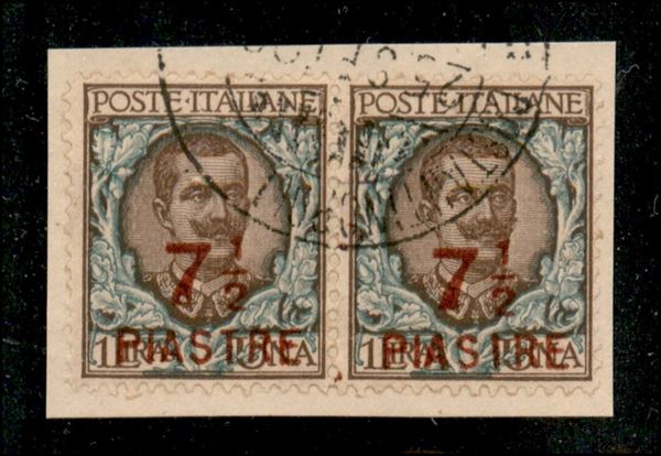 1922 - 7 1/2 piastre su 1 lira Floreale (64c) errore Piasire in coppia col normale - usato su frammento