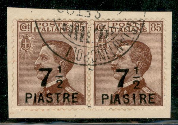 1922 - due 7 e 1/2 piastre su 85 cent Michetti (63/63c) - coppia orizzontale con pezzo di destra con errore PIASIRE - usati su frammento