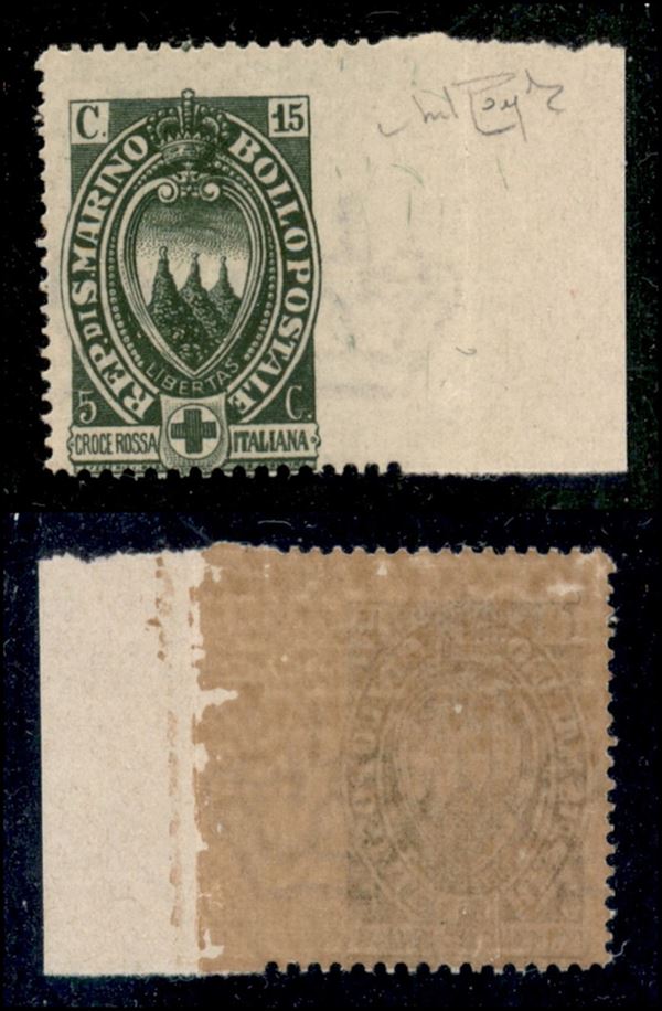 1923 - 15 cent Croce Rossa (92a) bordo foglio non dentellato a destra - gomma integra - cert. Raybaudi (1.500)