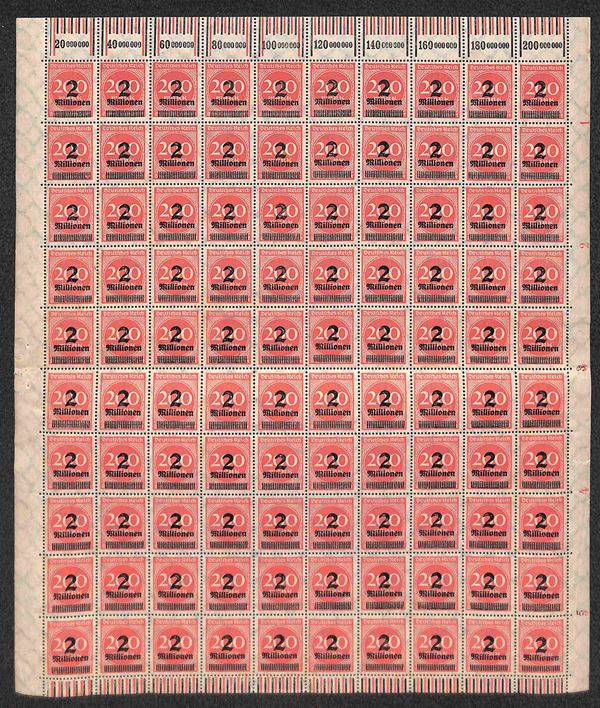1923 - 2 Millionen su 200 marchi (309) - intero foglio di 100 con bordi integri - gomma integra