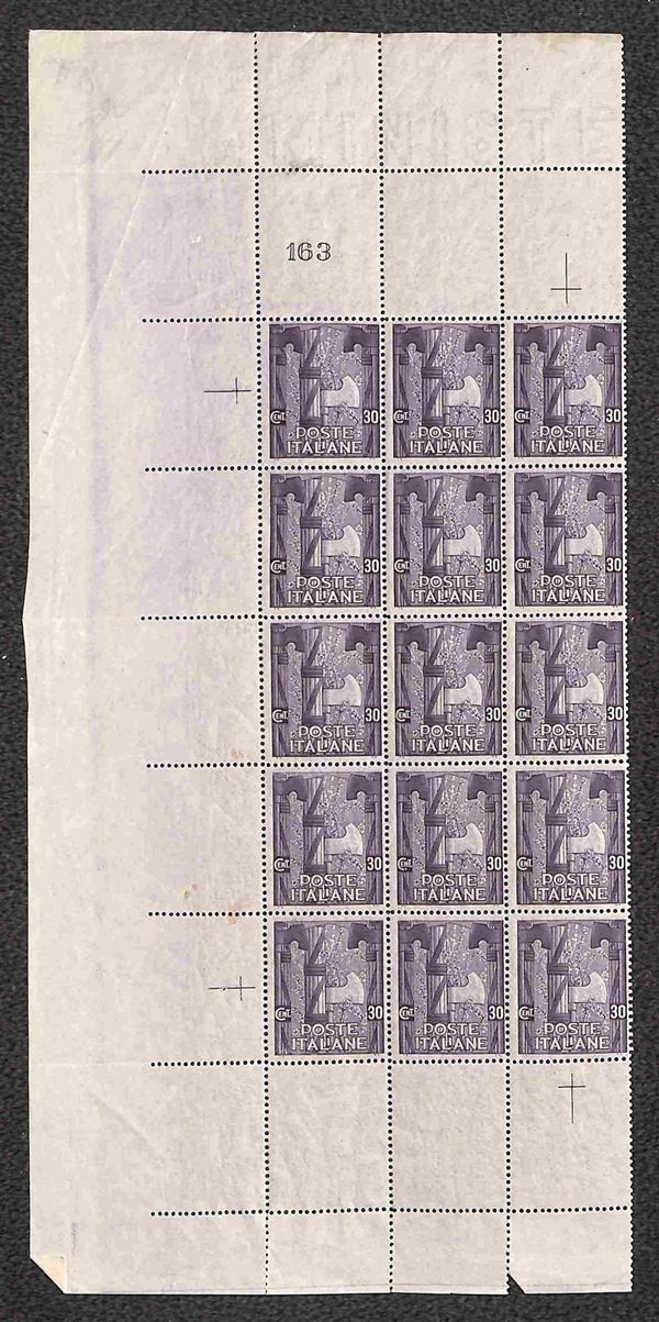 1923 - 30 cent Marcia su Roma (142) - blocco verticale di 15 (parte sinistra del foglio) con bordi interi e numero di Tavola 163 - gomma integra