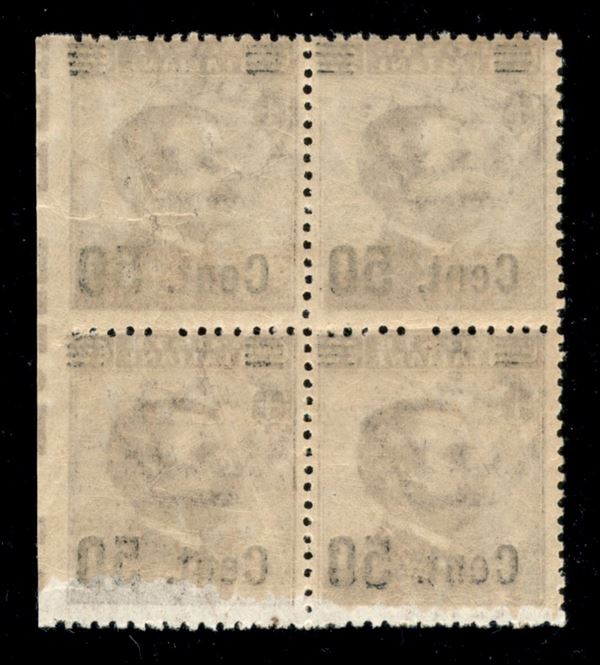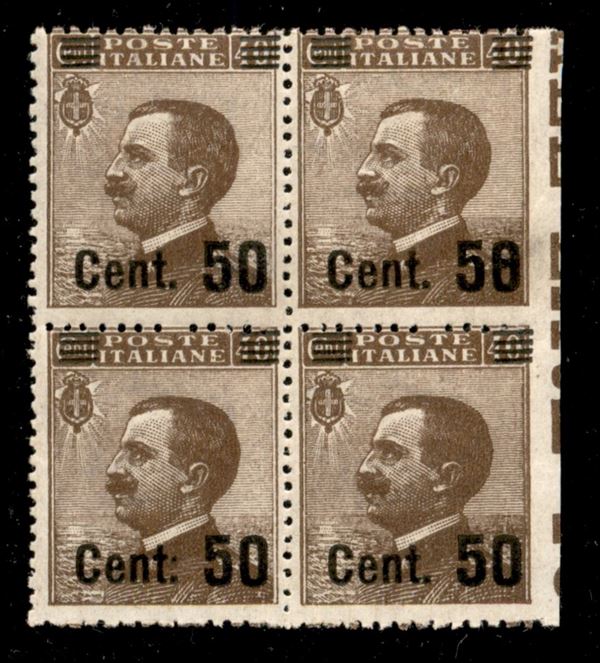 1923 - 50 cent su 40 (139zb + varietà yca) - quartina con leggero decalco del francobollo - coppia di destra con diciture marginali (dentellatura ritagliata) - gomma integra