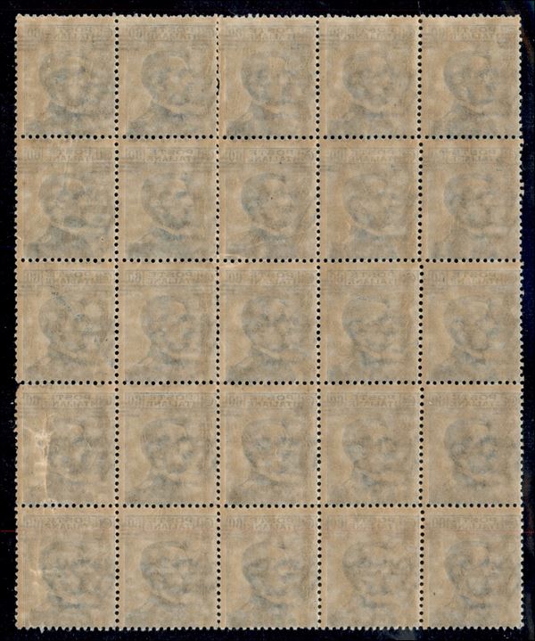 1924 - 25 cent su 60 Michetti (178 varietà b) - soprastampa obliqua - blocco di 25 - gomma integra - non catalogato