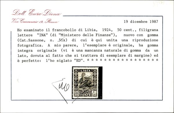 1924 - 50 cent Pittorica (51zg) con filigrana lettere complete centrali (INA - 14/10) - gomma integra con falla naturale da bordo foglio - ottimamente centrato - cert. Diena