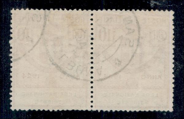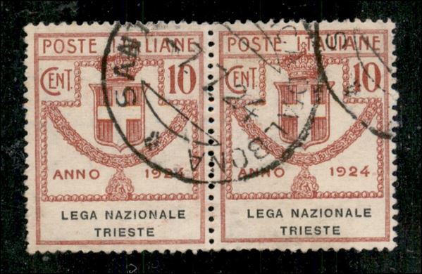 1924 - coppia del 10 cent Lega Trieste (43) usata - dentellatura carente in basso - ottima centratura