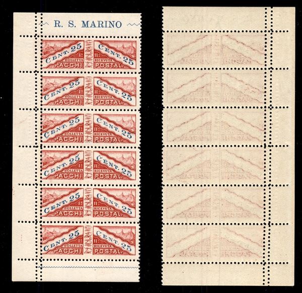 1928 - 25 cent (4) - blocco di sei con tripla dentellatura (una cieca) - gomma integra - non catalogato - cert. AG
