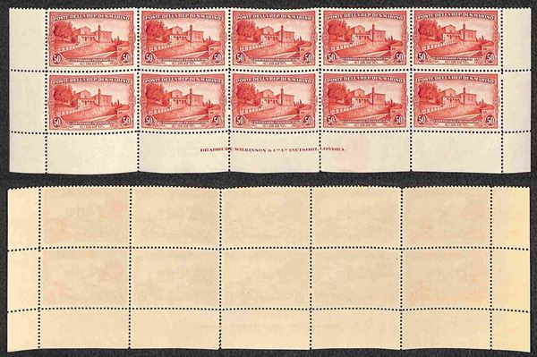 1928 - 50 cent S. Francesco (137) - blocco angolare di 10 (fine foglio) con scritte marginali complete - gomma integra (900++)