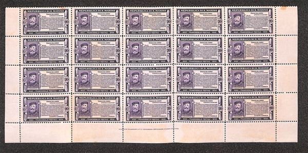 1932 - 20 cent Garibaldi (169) - blocco angolare di 20 (fine foglio con scritte marginali) - gomma integra con alcuni ingiallimenti - da esaminare (750)