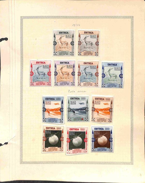 1934 - Arte Coloniale (220/225 + aerea 1/6) - serie completa - 12 valori applicati con linguella su foglio d'album - gomma originale